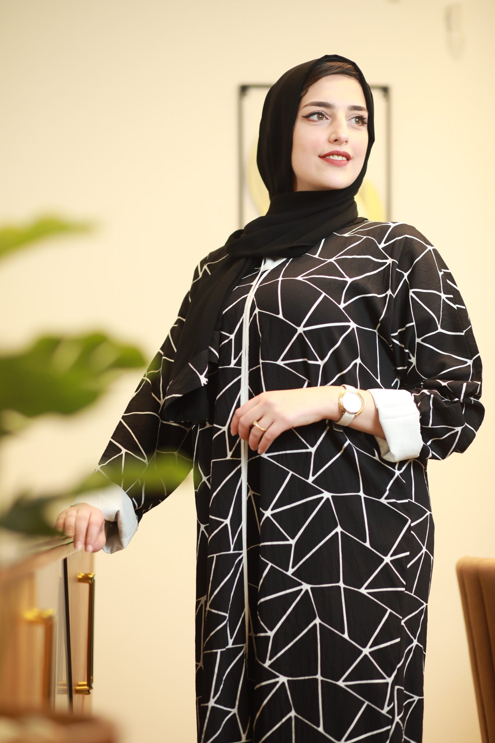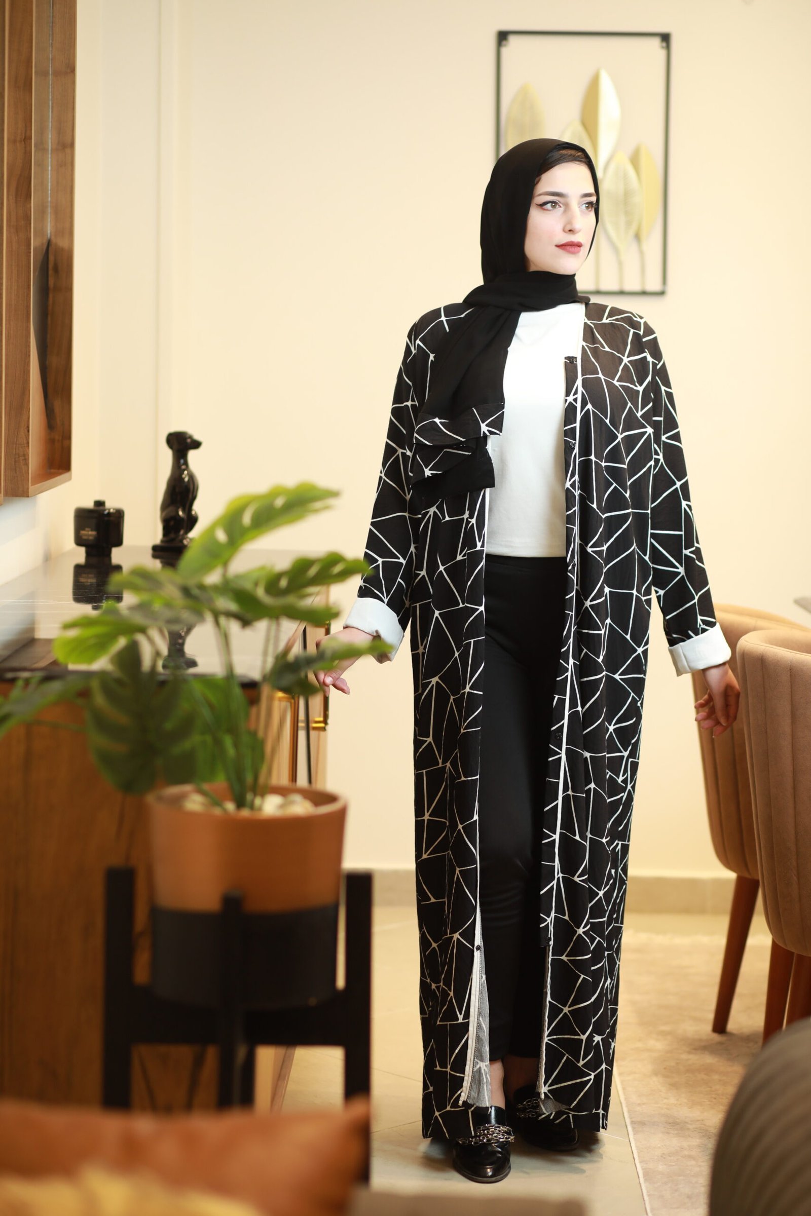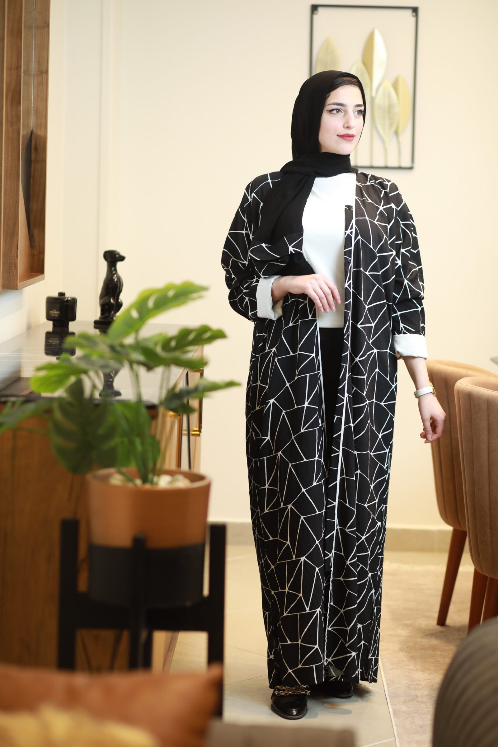 تألقي بإطلالة تخطف الأنظار مع هذه العباية الفريدة التي تمزج بين الفخامة والروح العصرية. تتميز بتصميم هندسي Geometric مبتكر يغطي كامل العباية بخطوط بيضاء حادة على خلفية سوداء داكنة، مما يمنحكِ قواماً ممشوقاً وحضوراً طاغياً.