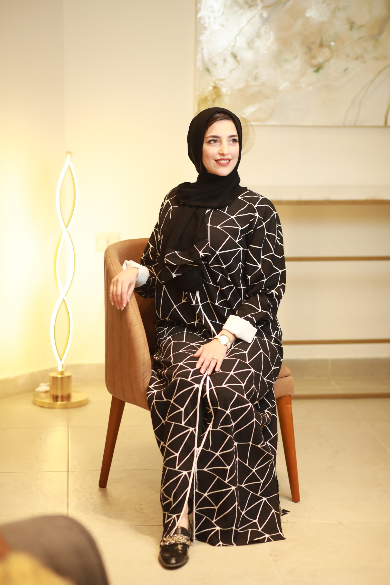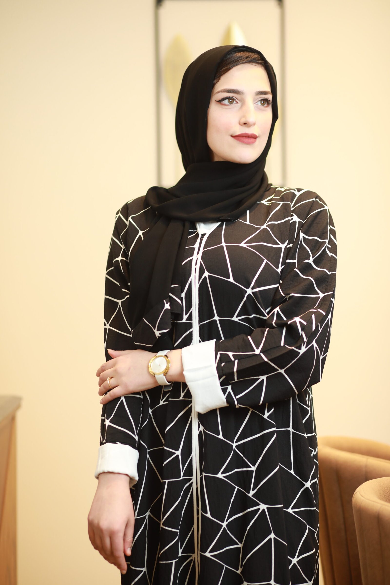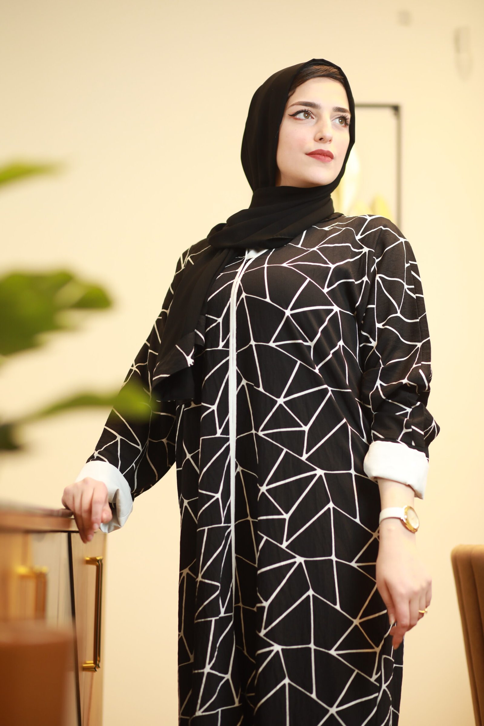 تألقي بإطلالة تخطف الأنظار مع هذه العباية الفريدة التي تمزج بين الفخامة والروح العصرية. تتميز بتصميم هندسي Geometric مبتكر يغطي كامل العباية بخطوط بيضاء حادة على خلفية سوداء داكنة، مما يمنحكِ قواماً ممشوقاً وحضوراً طاغياً.