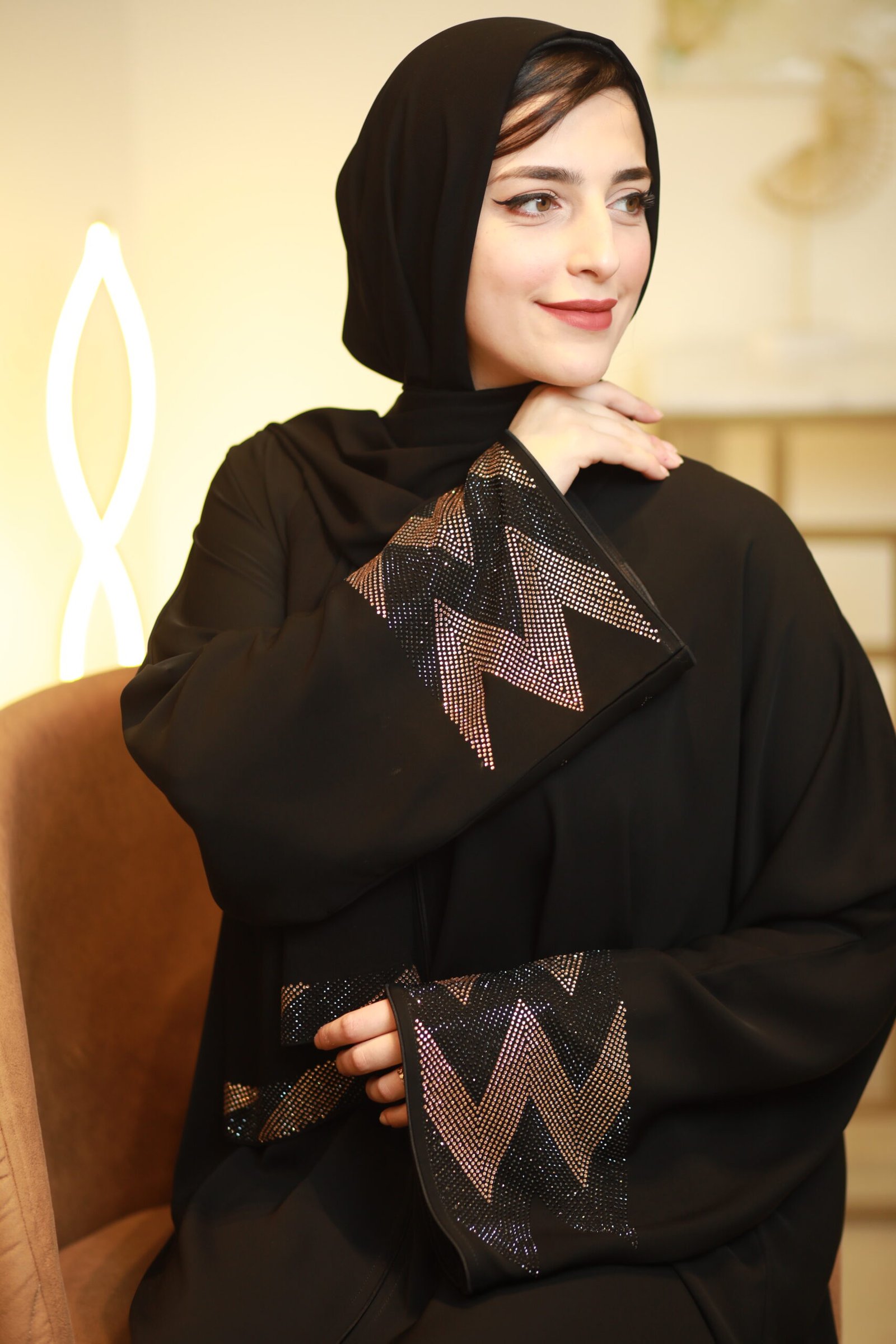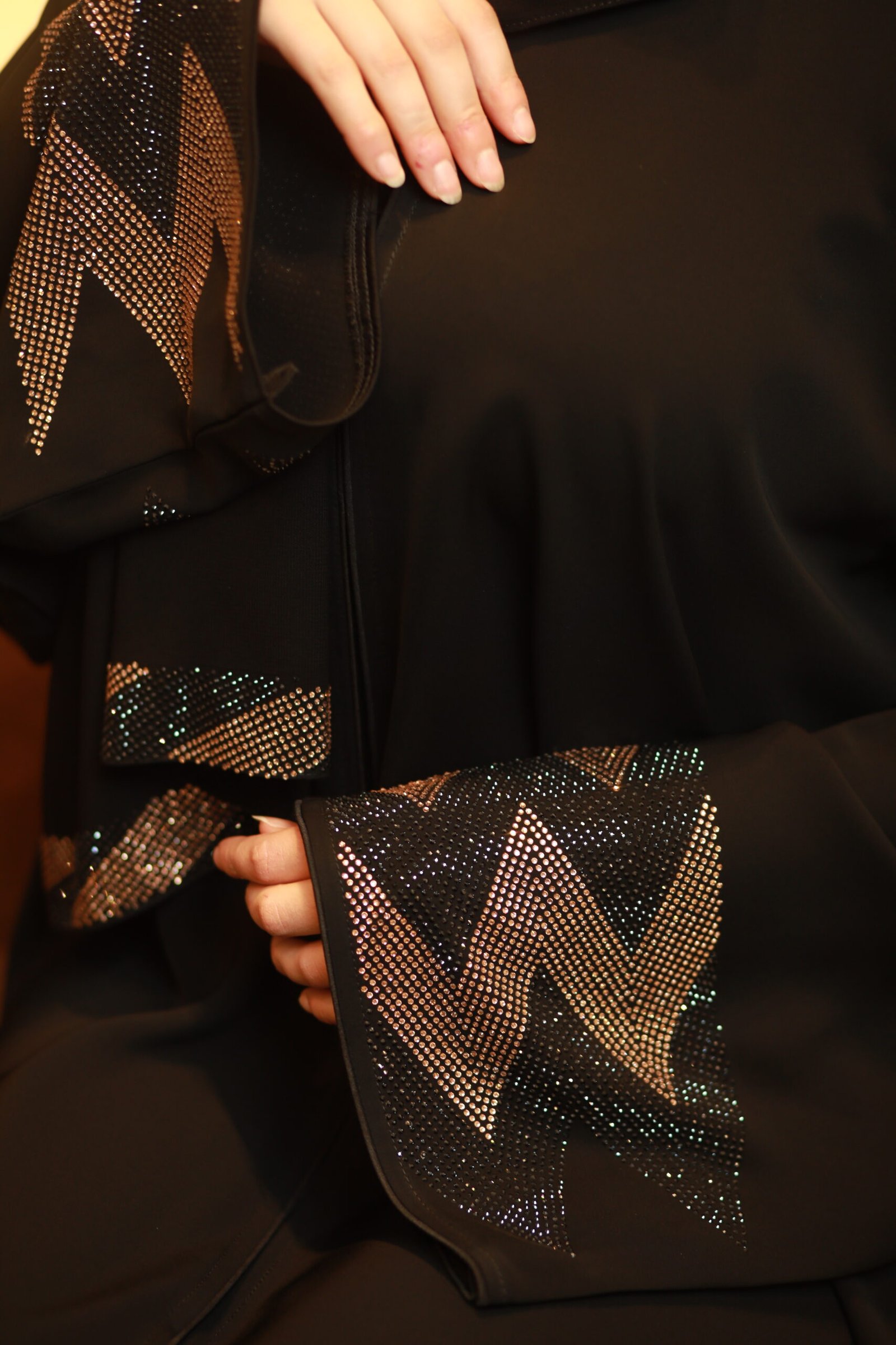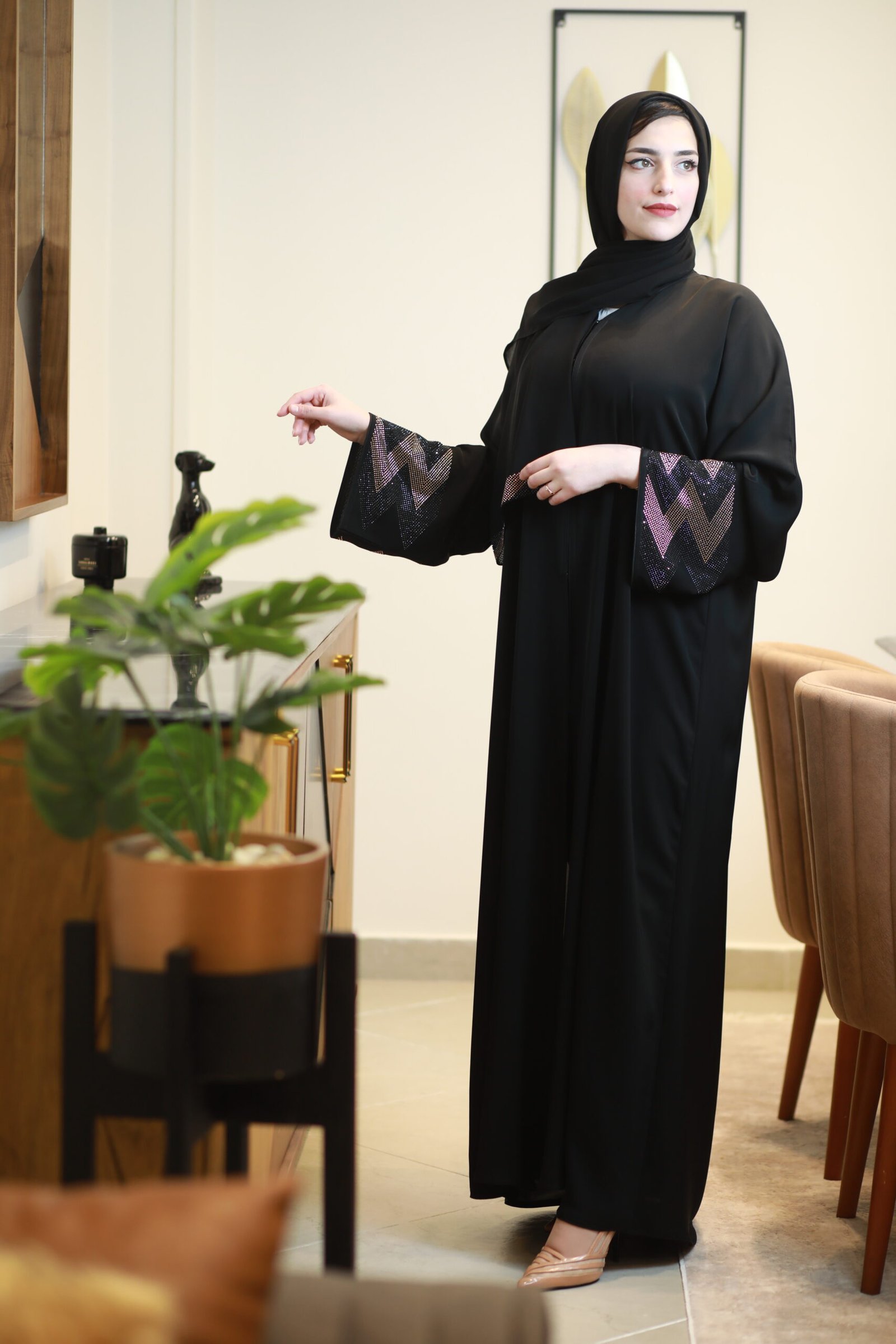 ادخلي عالم الأناقة الفاخرة مع عباية صُممت لتكون قطعة المجوهرات الخاصة بكِ. تتميز هذه العباية بلون أسود فاحم يبرز جمال تفاصيل الأكمام المزينة بنقوش هندسية من الكريستال الملون، الذي يعكس الضوء بألوان ساحرة تشبه أضواء الشفق.