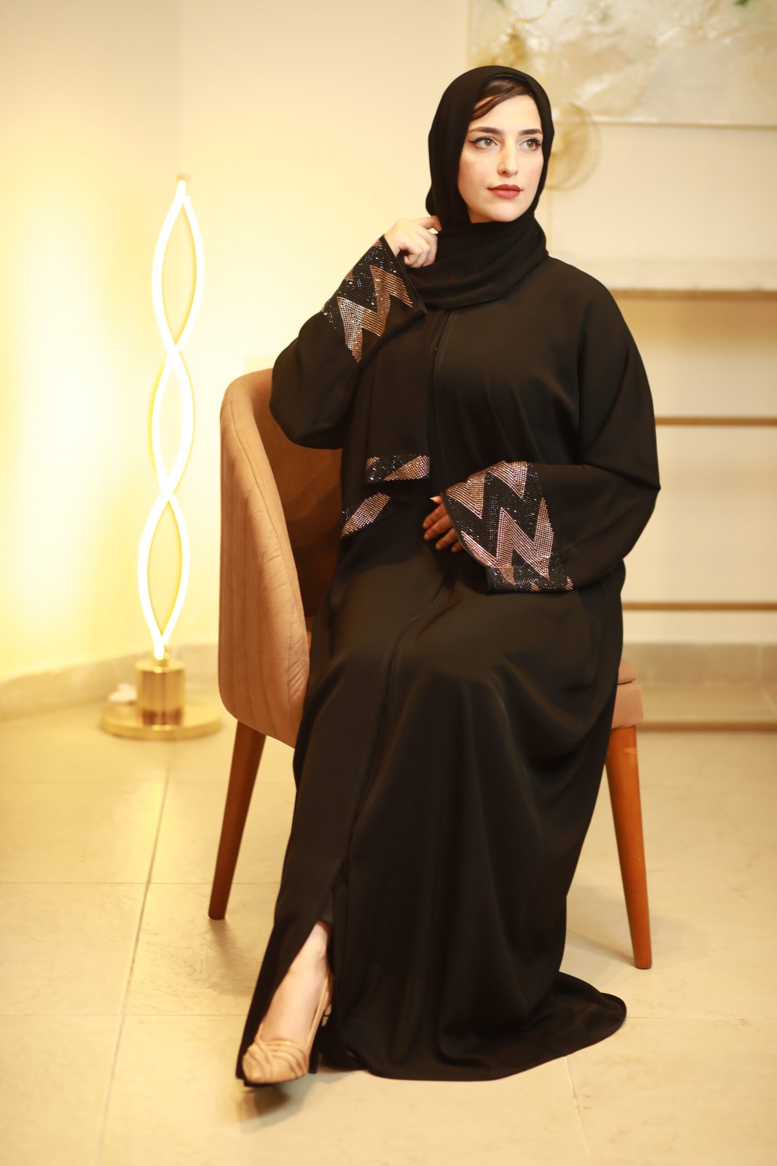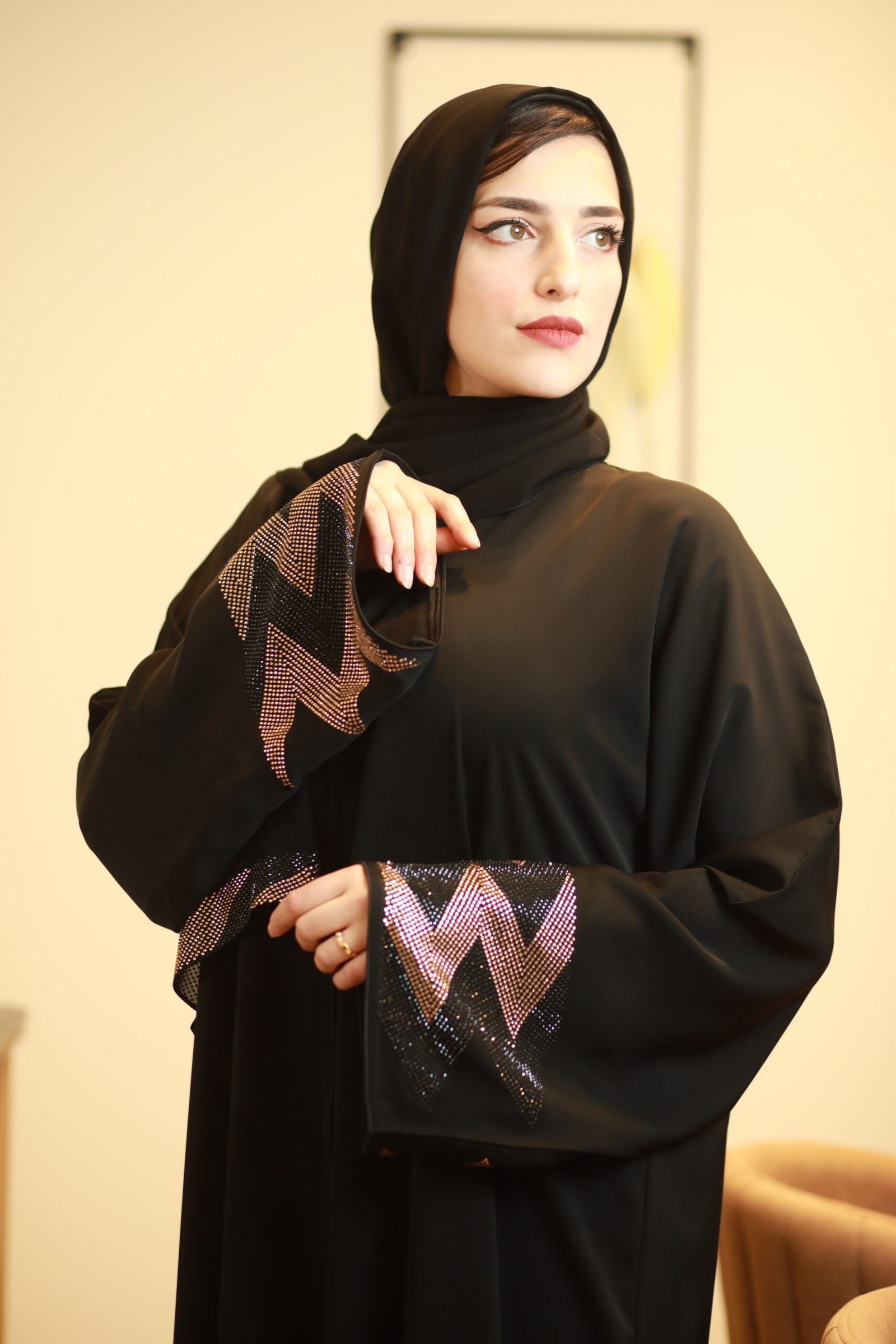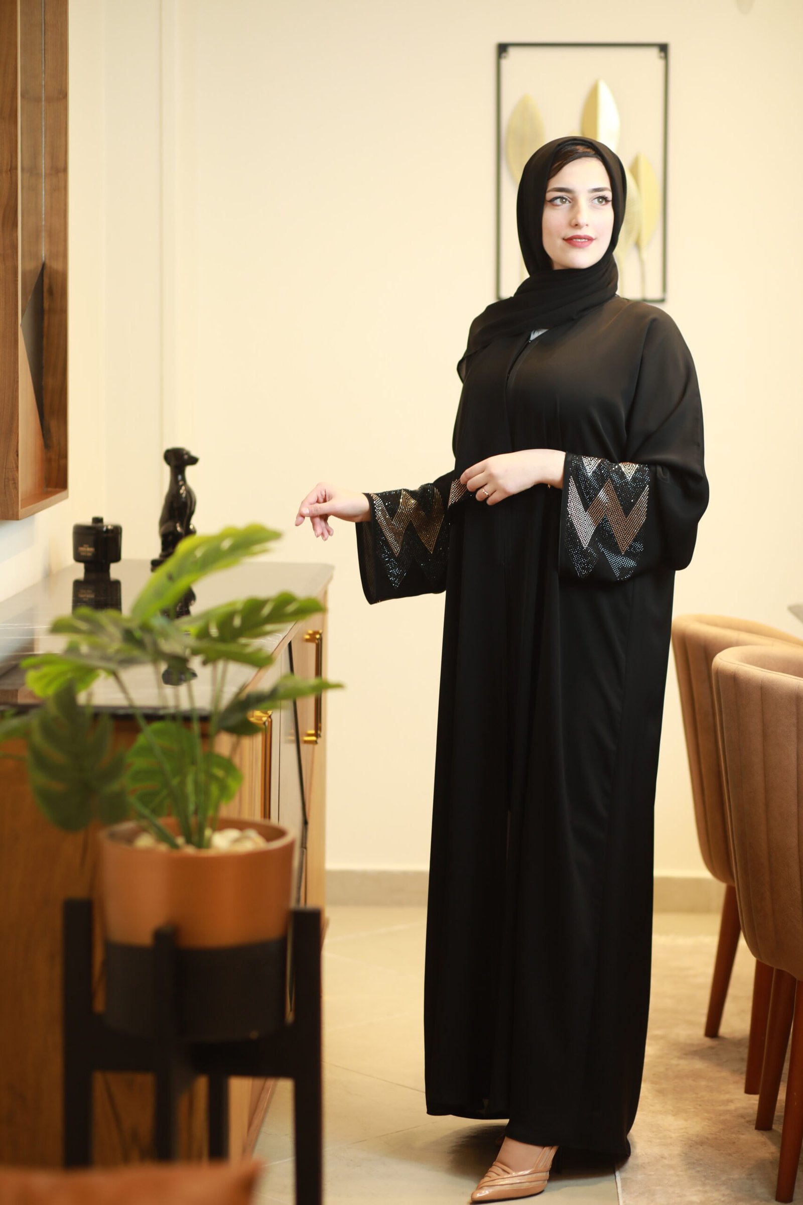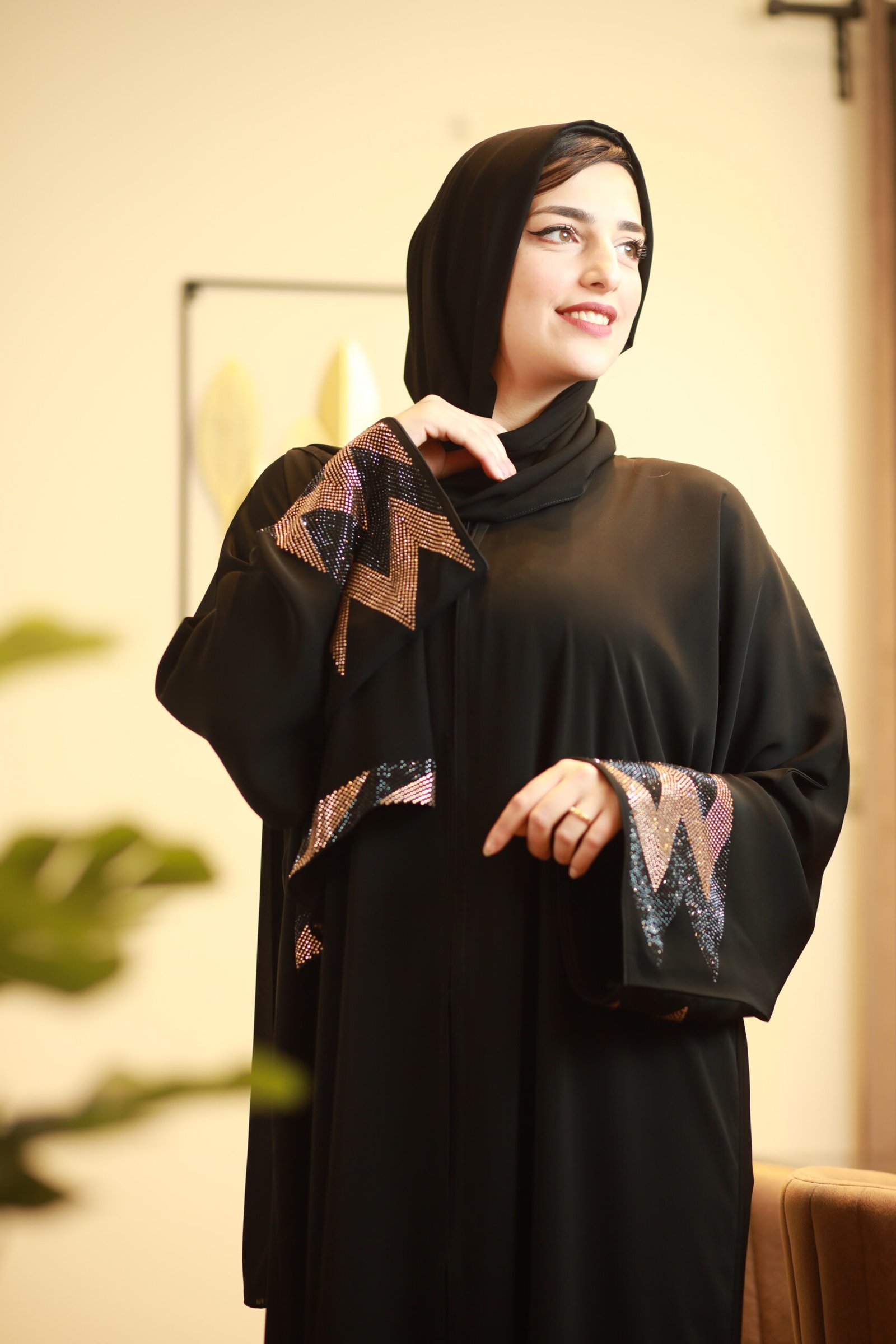 عباية سوداء كلاسيكية بتطريز كريستال هندسي تتميز هذه العباية بقصة واسعة ومريحة (A-line) تمنحكِ انسيابية تامة، وهي مصنوعة من قماش أسود فاخر غير شفاف ذو ملمس ناعم. تتركز جمالية التصميم في الأكمام الواسعة التي تزدان بتطريز كثيف من الكريستال (Strass) بنمط هندسي متداخل يجمع بين درجات النحاسي، الوردي، والأسود اللامع، مما يضفي لمسة من البريق الفخم دون مبالغة، مع قفلة أمامية مخفية لإطلالة متناغمة.
